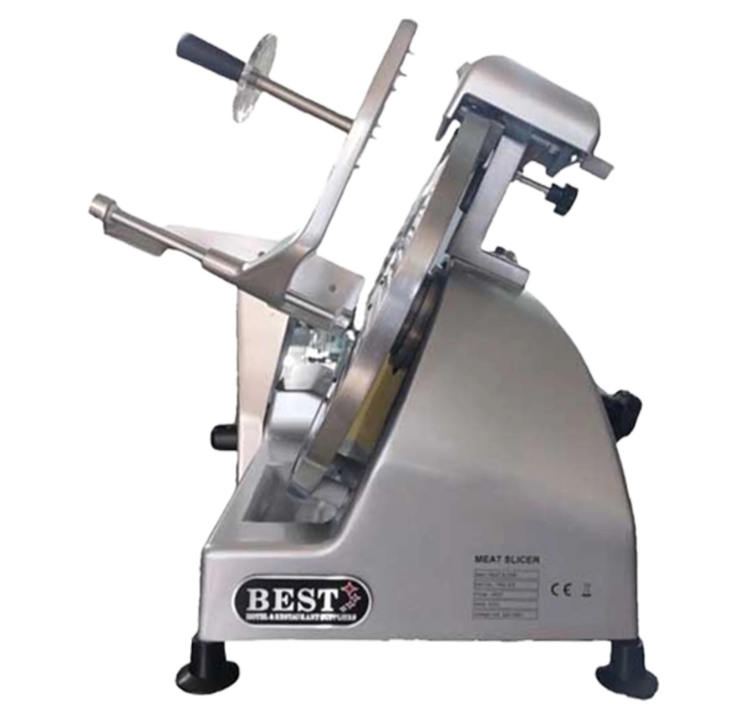 دستگاه کالباس بر دستی صنعتی برند بست (Best) قدرت 380 وات قطر تیغه 27.5 سانتی متر جنس بدنه آلومینیوم آنودایز شده ضخامت برش قابل تنظیم ابعاد 65×48×45 سانتی متر وزن 20 کیلوگرم کشور سازنده چین